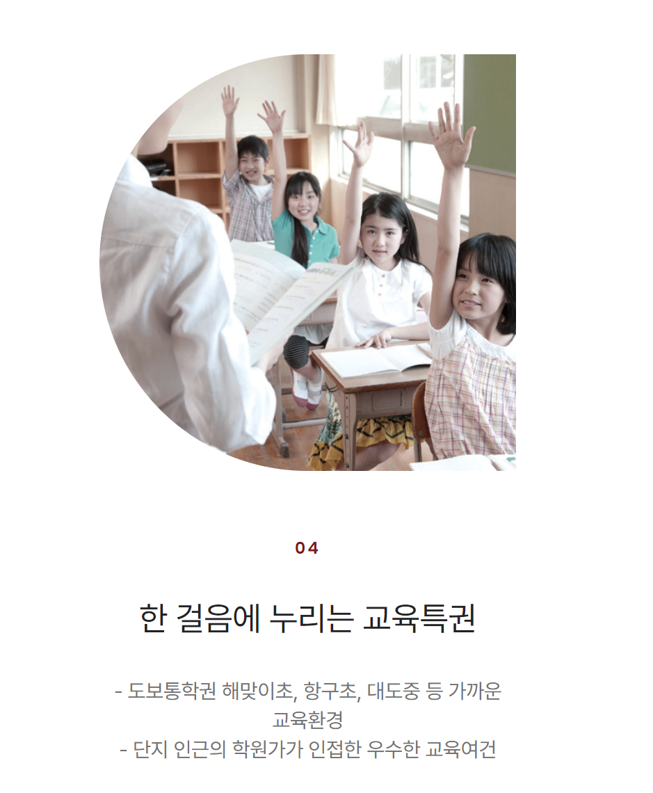 자녀들의 안전한 통학을 위한 도보통학이 중요한데 본 프로젝트 내에 초중교가 위치하여 있어 우수한 여건을 갖추었습니다. 반경 2km 내에 학원가가 위치하여 차량으로 약 8분이면 다양한 사교육 시설을 이용할 수 있는 위치입니다.