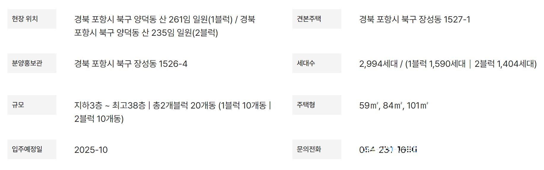 포항 현대힐스테이트는 1BL과 2BL로 나뉘어 총 2,994세대가 배치됩니다. 1BL은 양덕동 산261번지 일원이며 대지는 22,551.7평, 연면적은 81,503.3044평입니다. 건폐율과 용적률 그리고 단지 조경률은 12.4%와 249.6%, 48.57%로 구성되며 세대당 1.30대의 차량을 주차할 수 있습니다. 입주는 2025년 10월로 예정되어있습니다.